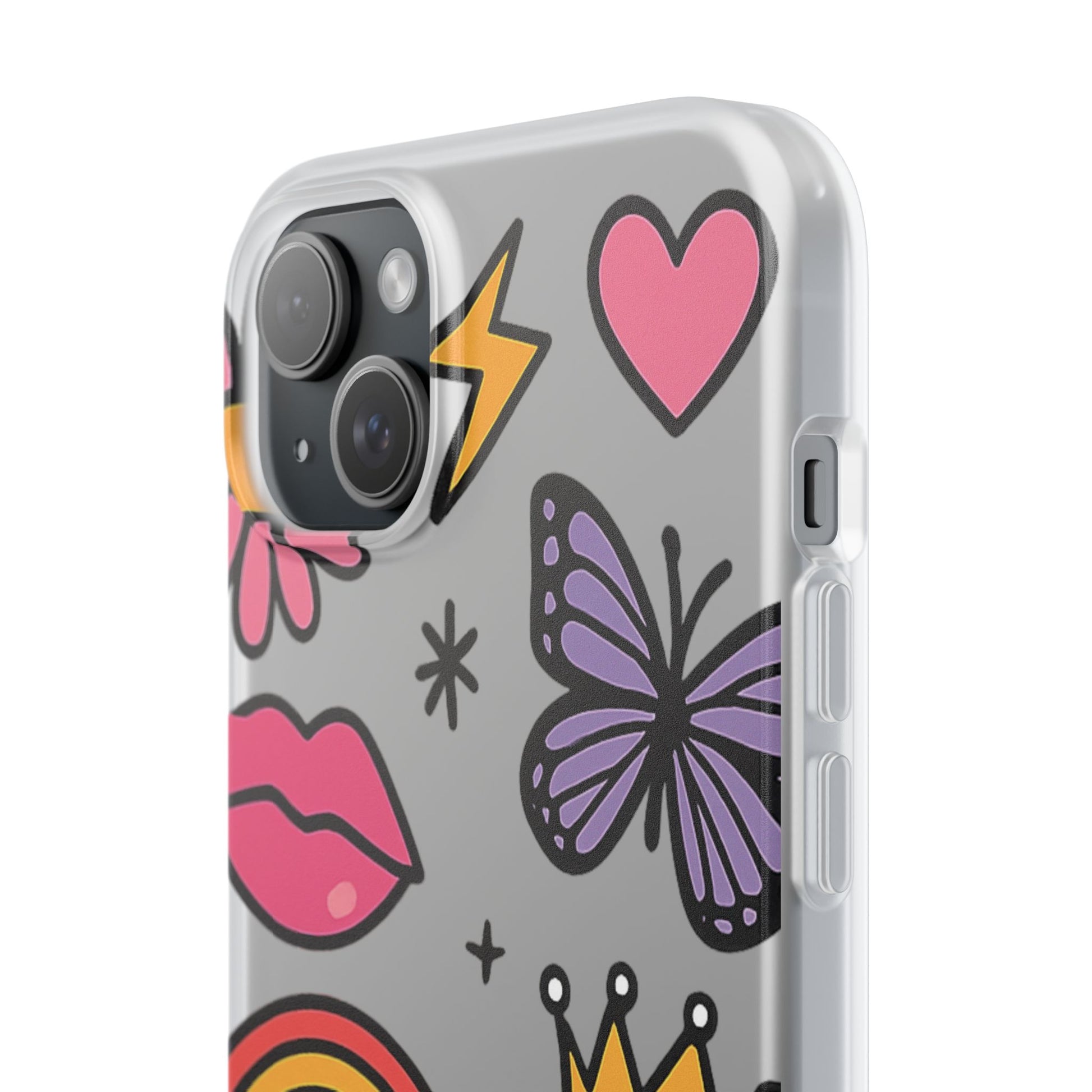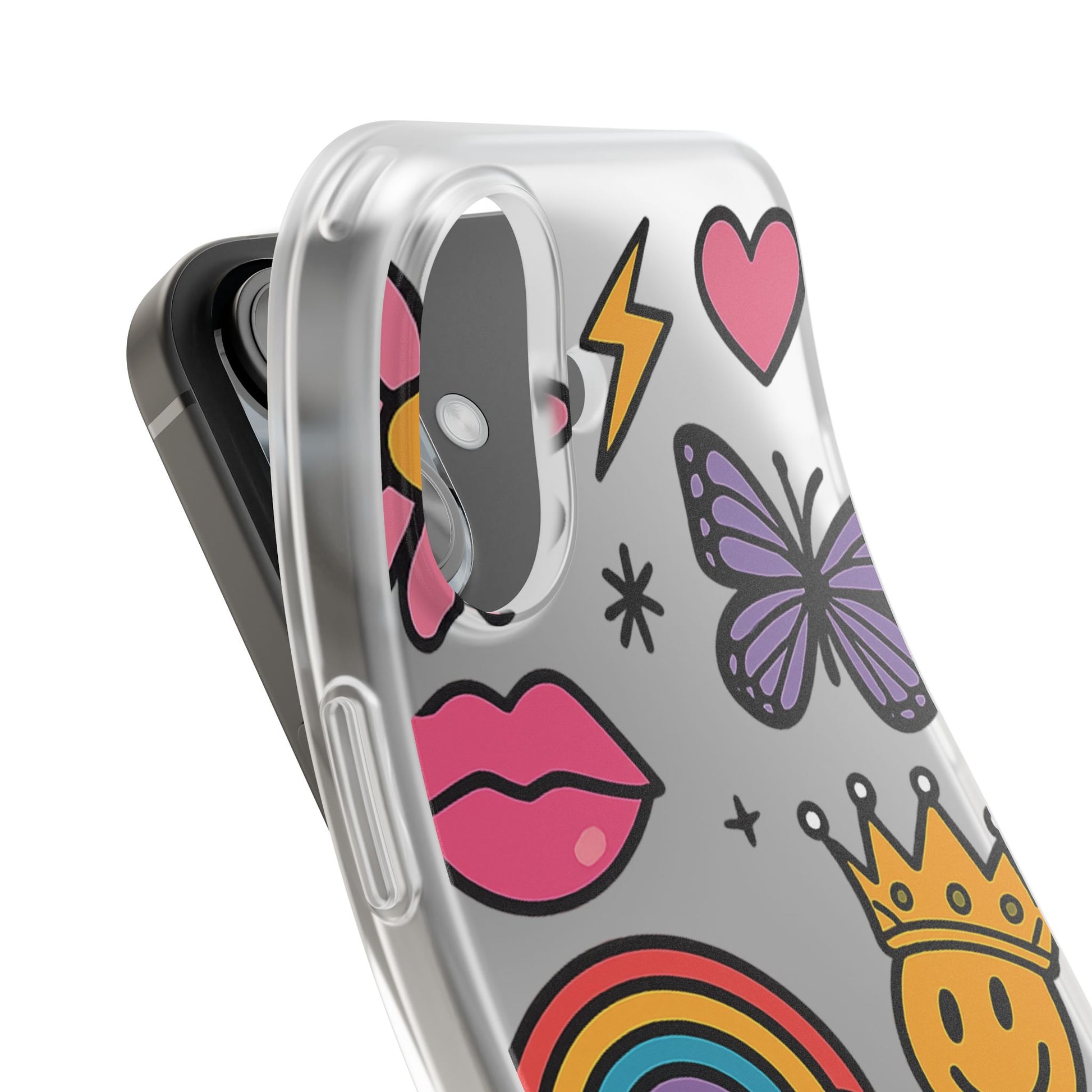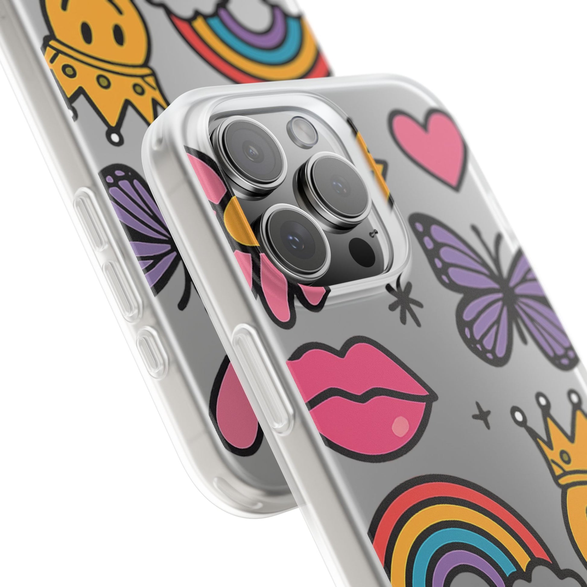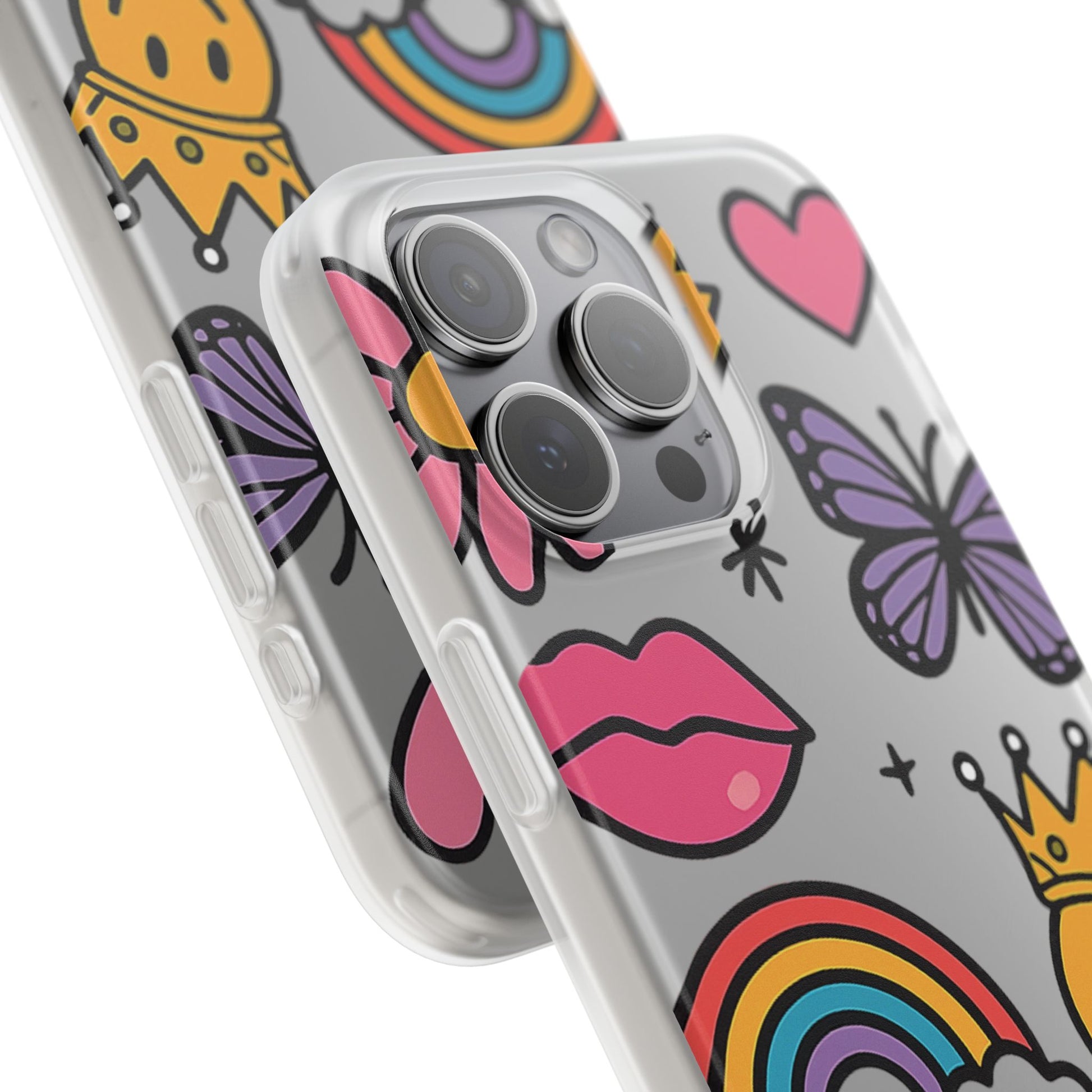 A slim, flexible phone case that adds playful personality without bulk. The semi-transparent matte TPU lets your phone peek through while a lively collage of stickers—rainbows, butterflies, a crowned smiley, speech bubbles and hearts—brings bright, youthful energy to your everyday carry. The frosted finish feels smooth in hand and the low-profile fit slides easily into pockets or bags. Engineered with impact-resistant material and precise cutouts, it protects against everyday drops while still supporting wireless charging. Thoughtful certifications and optional gift packaging make it a confident, polished choice for fans of bold, quirky style.