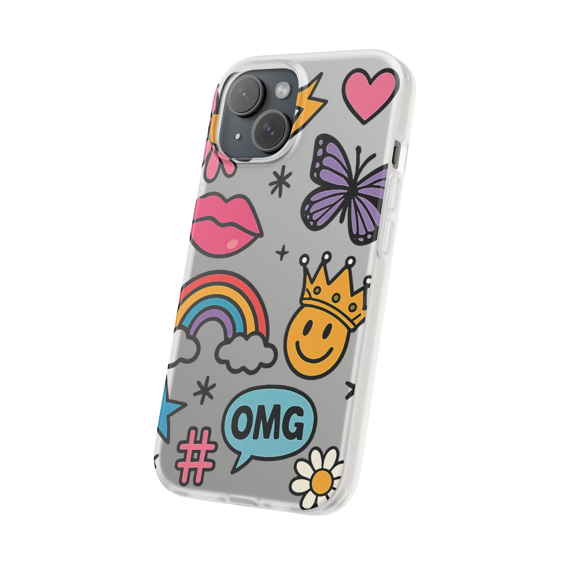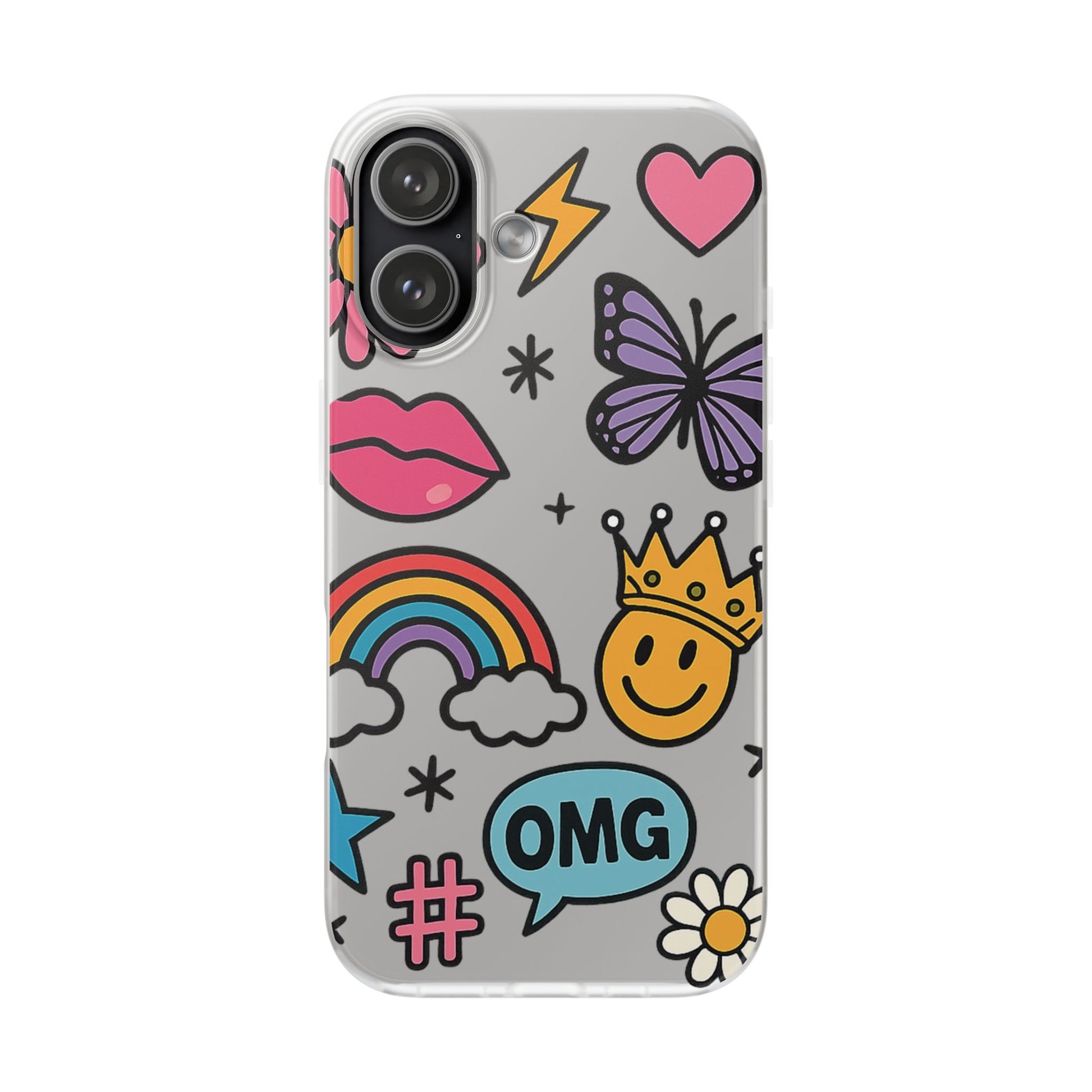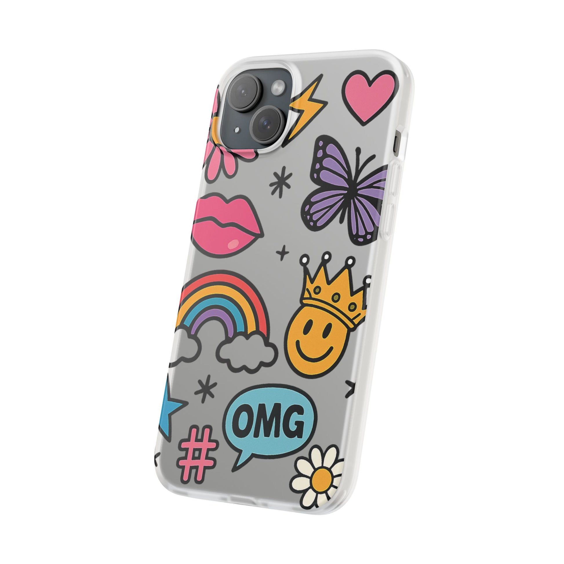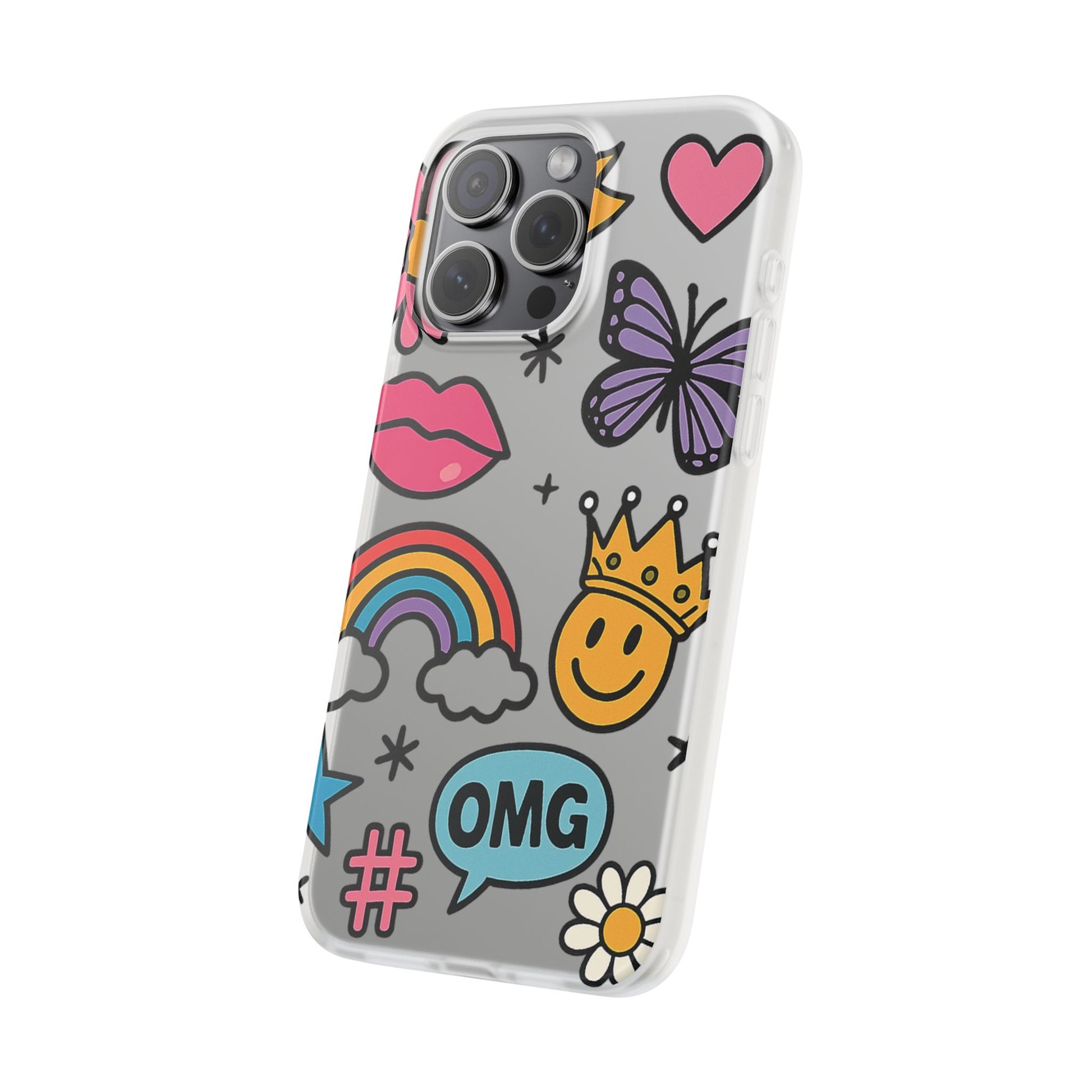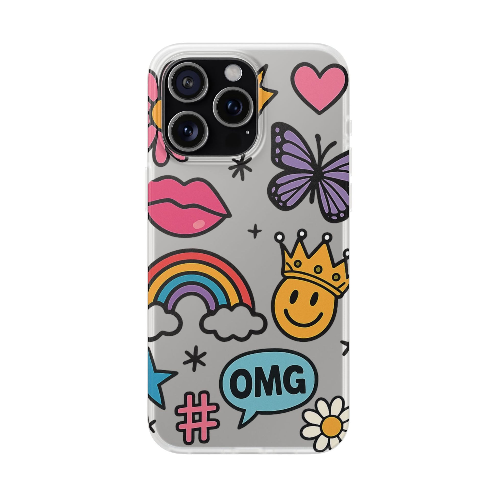 A slim, flexible phone case that adds playful personality without bulk. The semi-transparent matte TPU lets your phone peek through while a lively collage of stickers—rainbows, butterflies, a crowned smiley, speech bubbles and hearts—brings bright, youthful energy to your everyday carry. The frosted finish feels smooth in hand and the low-profile fit slides easily into pockets or bags. Engineered with impact-resistant material and precise cutouts, it protects against everyday drops while still supporting wireless charging. Thoughtful certifications and optional gift packaging make it a confident, polished choice for fans of bold, quirky style.