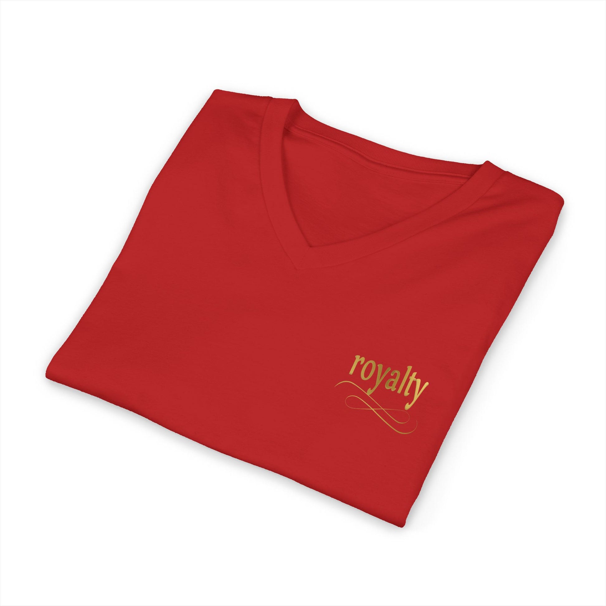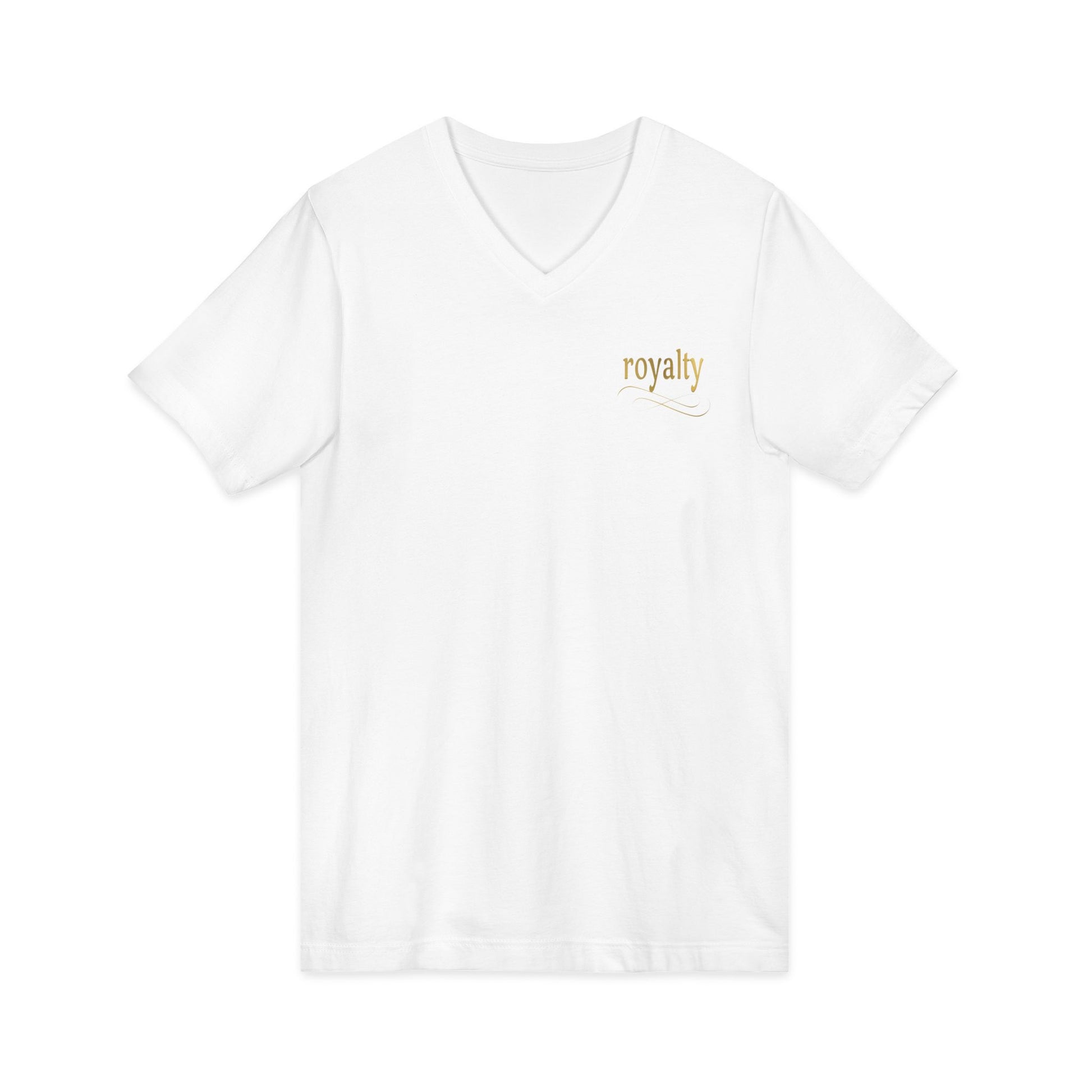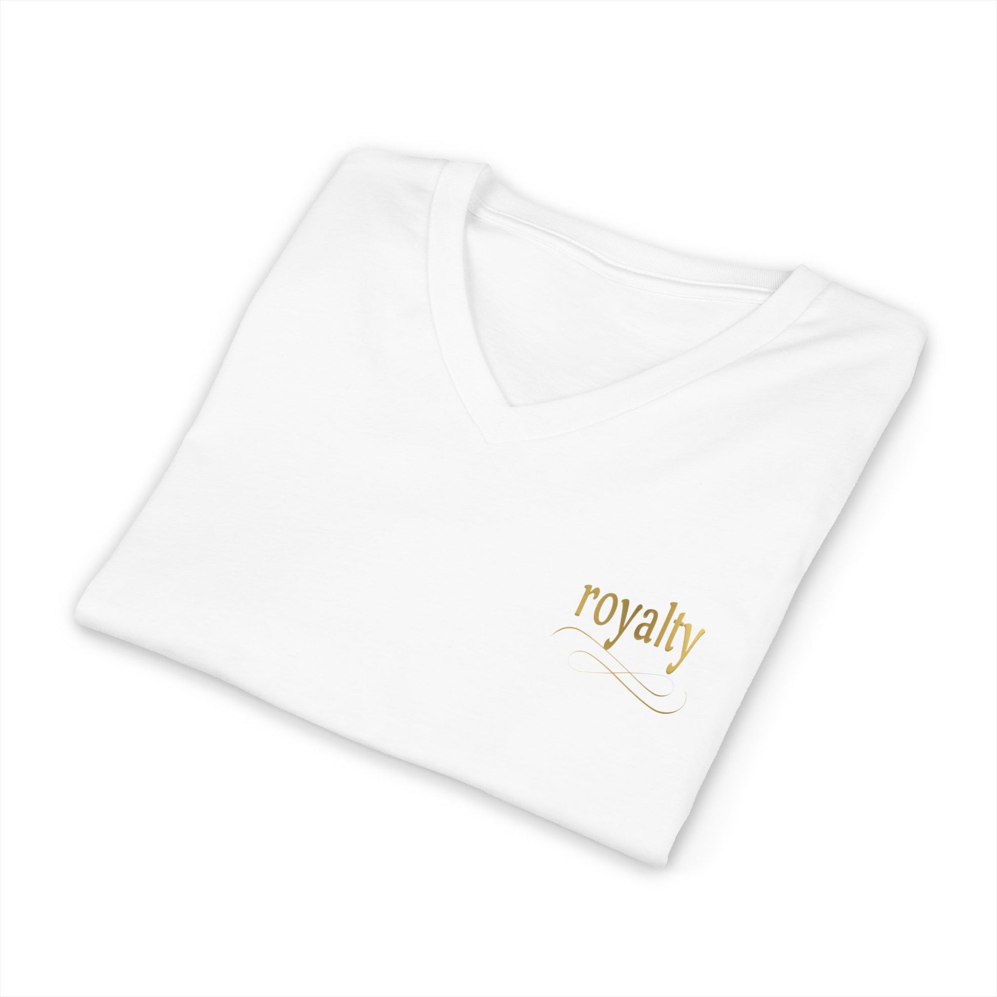 This lightweight V-neck tee brings a quiet touch of elegance to everyday wear. The gold calligraphy “Royalty” script catches the light with a subtle, refined shimmer that reads like a personal emblem. Soft, breathable cotton lays gentle against the skin while the retail fit and V-neck create a clean, confident silhouette. Wear it on slow mornings with jeans, layered under a blazer for a casual meeting, or tucked into a skirt for an evening out — the lettering adds a nod to timeless style without shouting for attention. The thoughtful construction — shoulder tape, side seams and a ribbed collar — keeps the shape crisp wash after wash, so the design remains the focal point. Ethically made and finished with a tear-away label, this tee balances comfort, conscience, and quiet sophistication.