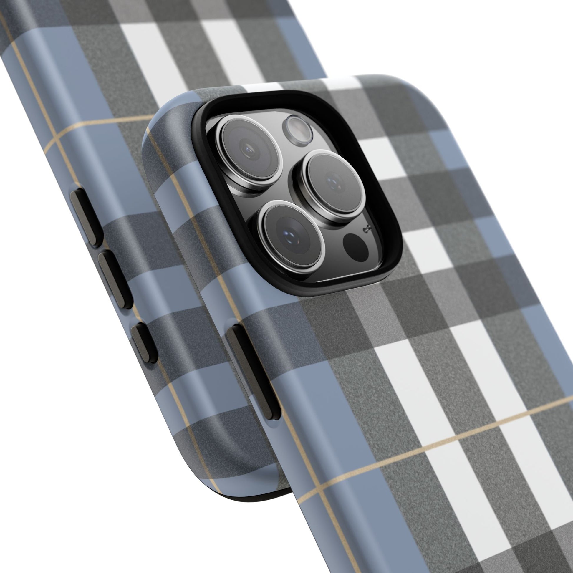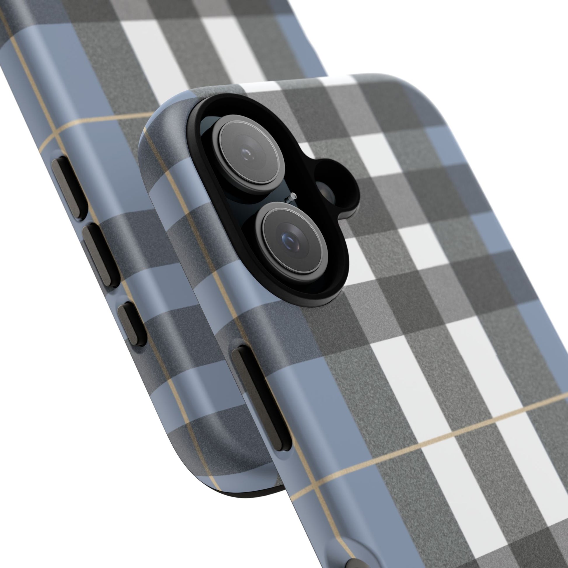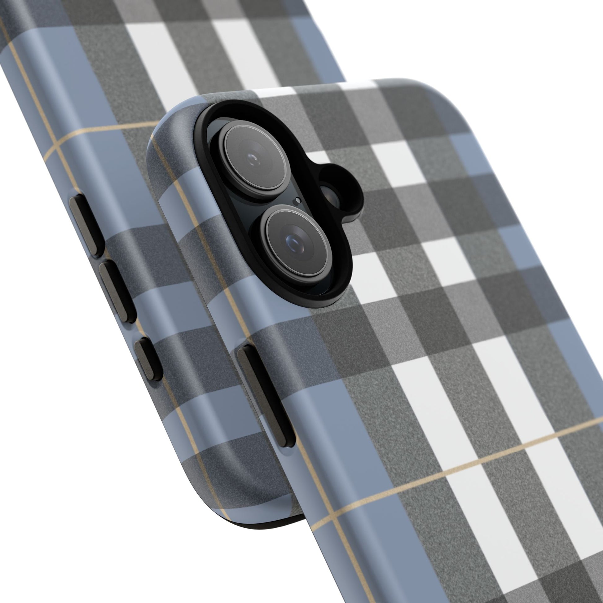 A sleek, durable phone case that blends everyday protection with a calm, modern plaid. The dual-layer construction — a rigid polycarbonate shell and a shock-absorbing TPU silicone liner — keeps your device safe from drops and impacts while maintaining a slim profile. The full-wrap 3D print shows a soft blue, grey and white tartan with subtle tan accent lines for a composed, timeless look. UV-protected inks and certified materials mean the pattern keeps its clarity outdoors and the case meets major safety and environmental standards. Glossy or matte finishes and clear port openings keep the case practical: it supports wireless charging, fits new iPhone 17 models, and resists everyday wear when handled with normal care.